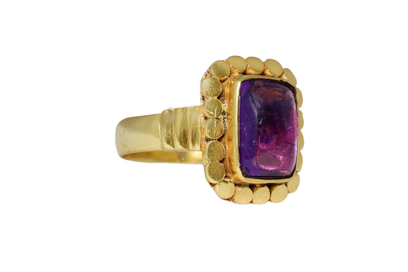 Beautiful handmade brass ring features a vibrant, deep purple Amethyst cabochon cut into a bold rectangle shape. The striking gemstone is framed by an ornate Rava balls (granulation) border that adds a rich, textured feel. The polished brass band complements the centerpiece with subtle detailing on the shoulders, making this a unique and substantial statement piece.