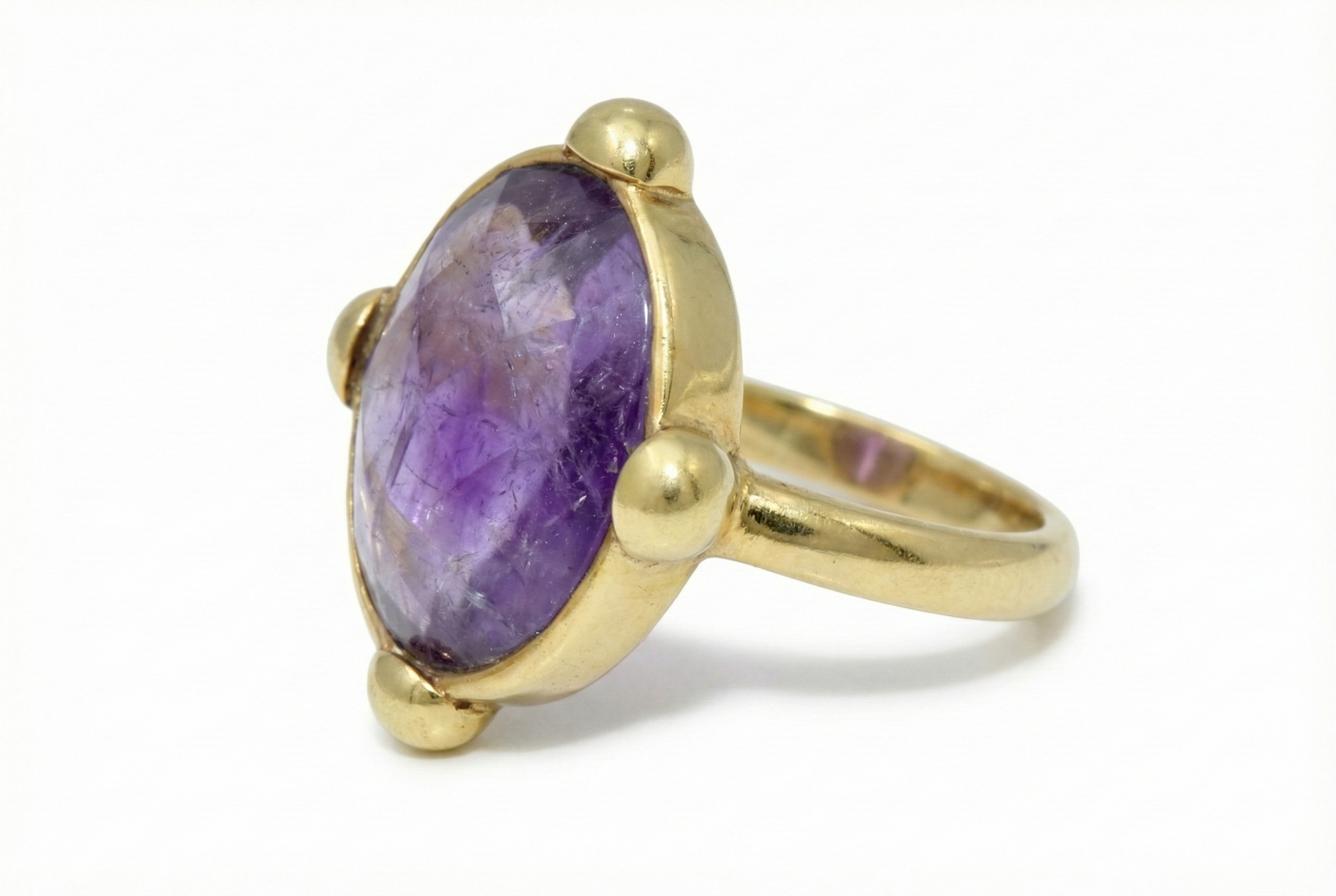 This striking handmade brass ring features an oval checker-cut natural amethyst, exuding a rich purple hue. The natural gemstone is set elegantly in a bezel setting with four bold brass prongs, adding both security and a distinctive handcrafted charm to the piece.